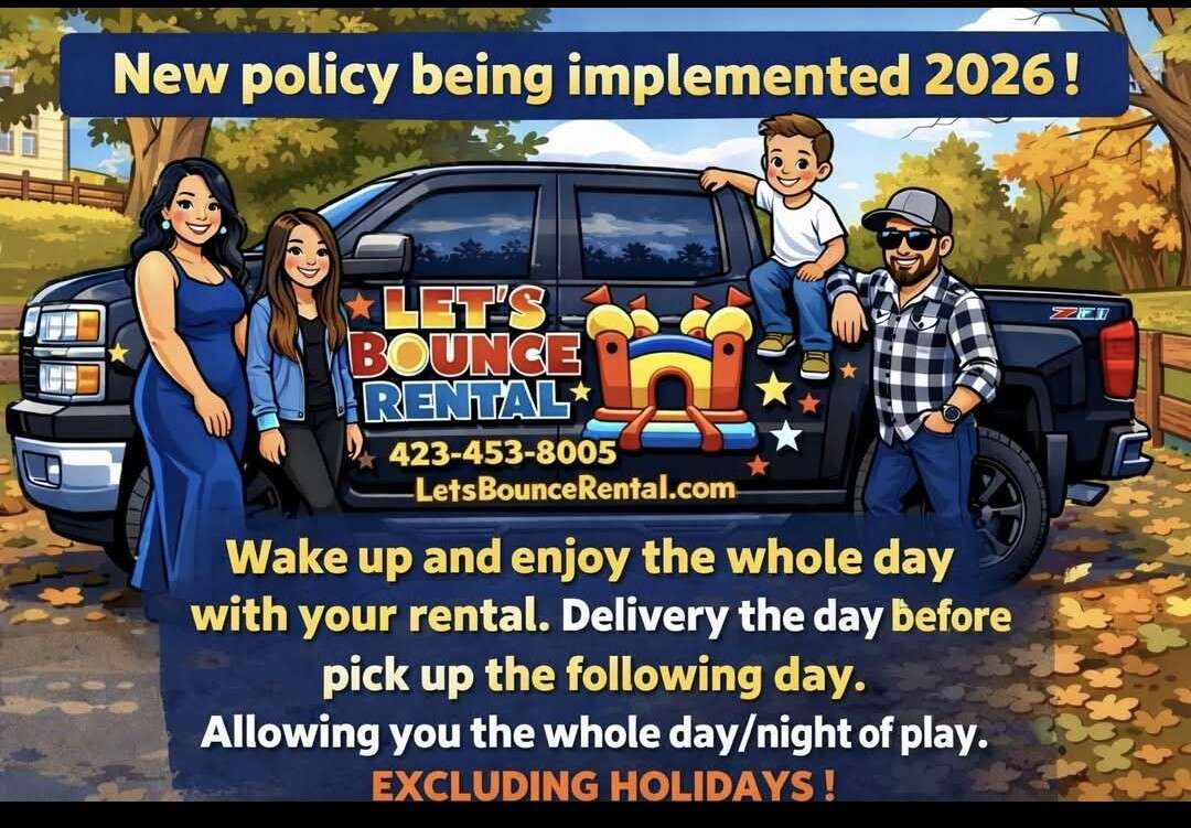 Let’s Bounce Rental is Cleveland Tennessee’s trusted inflatable rental company offering bounce houses, water slides, obstacle courses, tents, tables, and party equipment rentals. We proudly serve Cleveland, Athens, Decatur,Ooltewah,Chattanogga, and surrounding countys with clean, sanitized, and professionally maintained equipment for birthdays, school events, church functions, and community festivals.