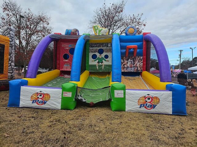 The 3-in-1 Sport Play features a durable basketball hoop , football game, and soccer game.