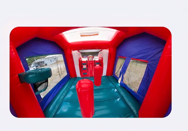 Our Santa's Village Combo Bounce House offers a spacious bouncing area, an exciting slide, and an adventurous climbing wall, providing endless fun and entertainment for kids of all ages. It's designed with safety in mind, featuring sturdy construction and mesh windows for easy supervision.